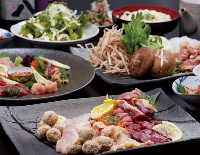 【あまから手帖神戸うまい店100選】に掲載される創業28年の「とり徹」の三宮店。大分の契約養鶏場から直接仕入れるここだけでしか味わえない地鶏が楽しめます。お客様のテーブルで備長炭を使い網焼きで提供いたします。